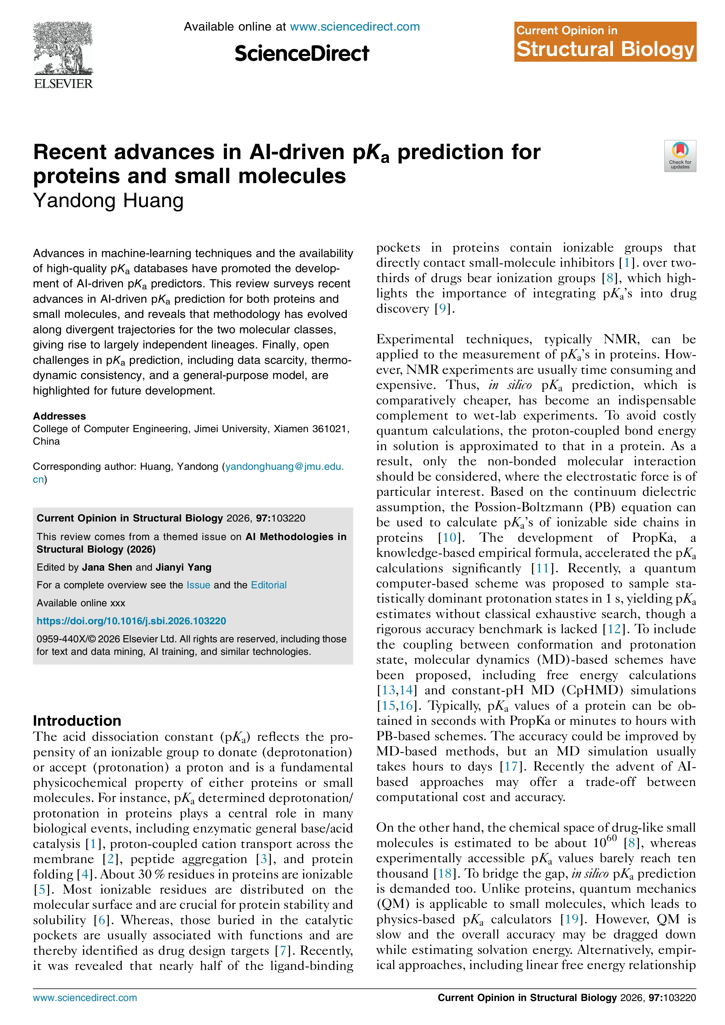 Date :期刊专题《AI Methodologies in Structural Biology》邀稿综述;题目:Recent advances in AI-driven pK a prediction for proteins and small molecules. 文章链接:https://www.sciencedirect.com/science/article/abs/pii/S0959440X26000023